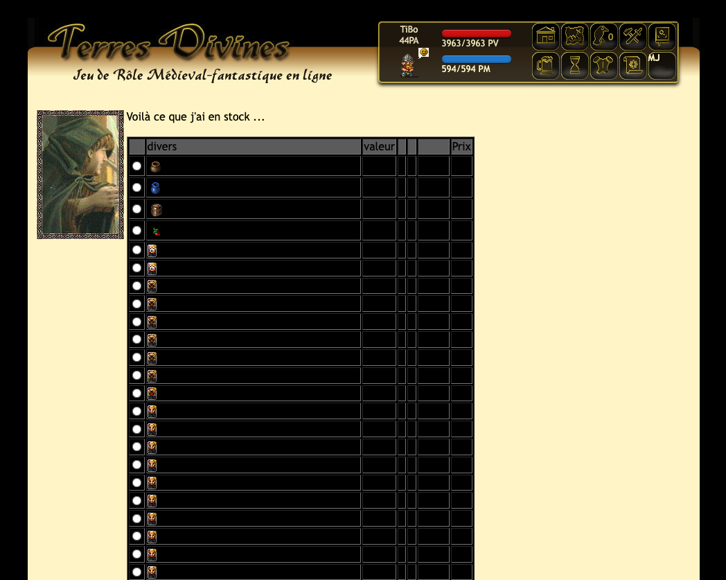 TiBo il faut absolument quand tu auras un peu de temps devant toi qu'on échange sur les marchands au moins modifier la couleur des textes parce que c'est impossible d'acheter qqch actuellement je sais pas si c'est propre a mon potable mais on y vois absolument rien :etone: